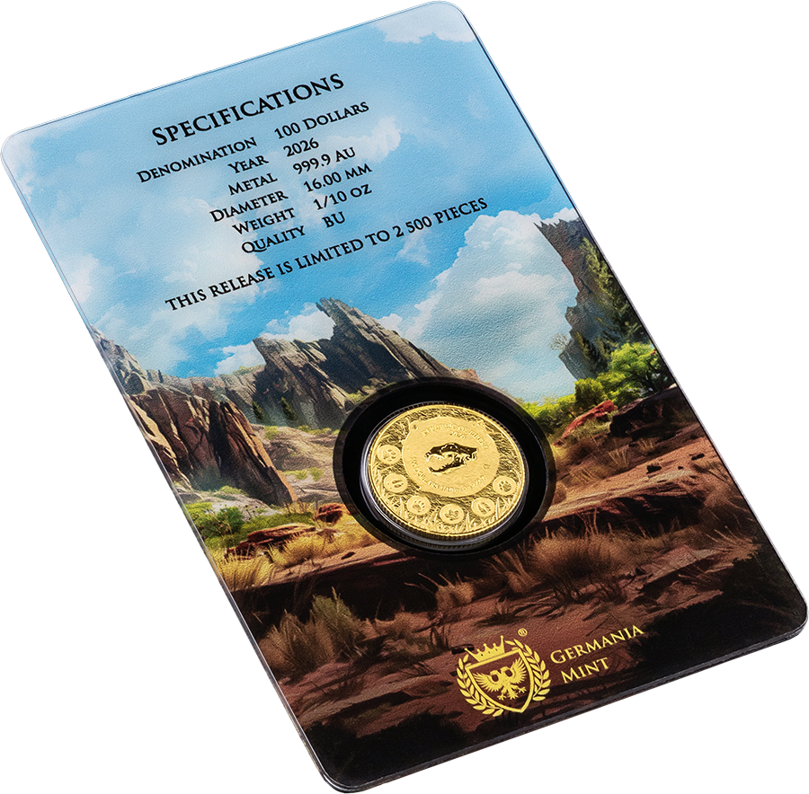 Deze 1/10 oz 999,9 puur gouden verzamelmunt maakt deel uit van Germania Mint’s Megafauna-serie en toont de formidabele Cave Lion, vastgelegd in kostbaar goud — een premium editie die een van de machtigste toppredators van de IJstijd viert.