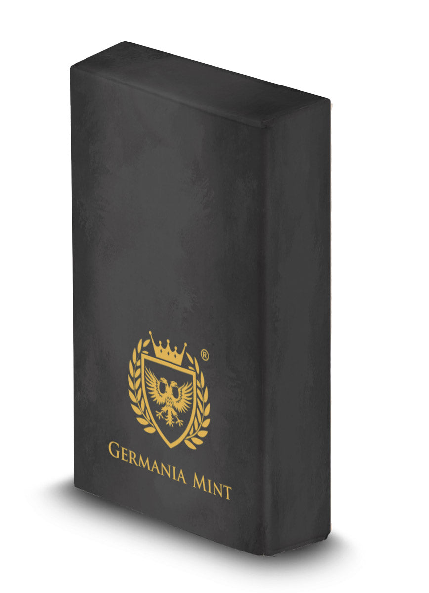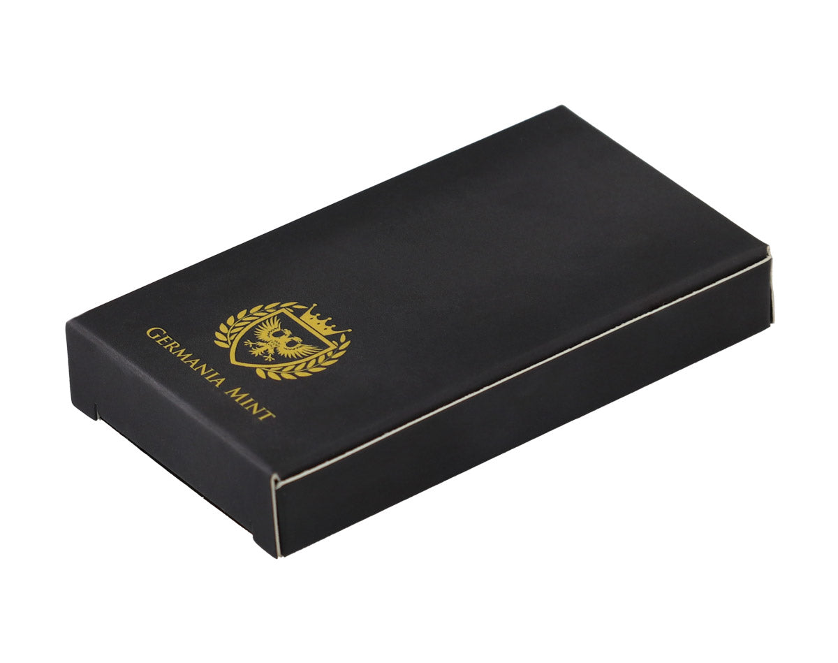 De verpakking weerspiegelt dezelfde zorg. Je bar wordt vacuüm verzegeld geleverd om oxidatie te voorkomen en is verpakt in een speciaal ontworpen doos van Germania Mint — bescherming én presentatie in één.