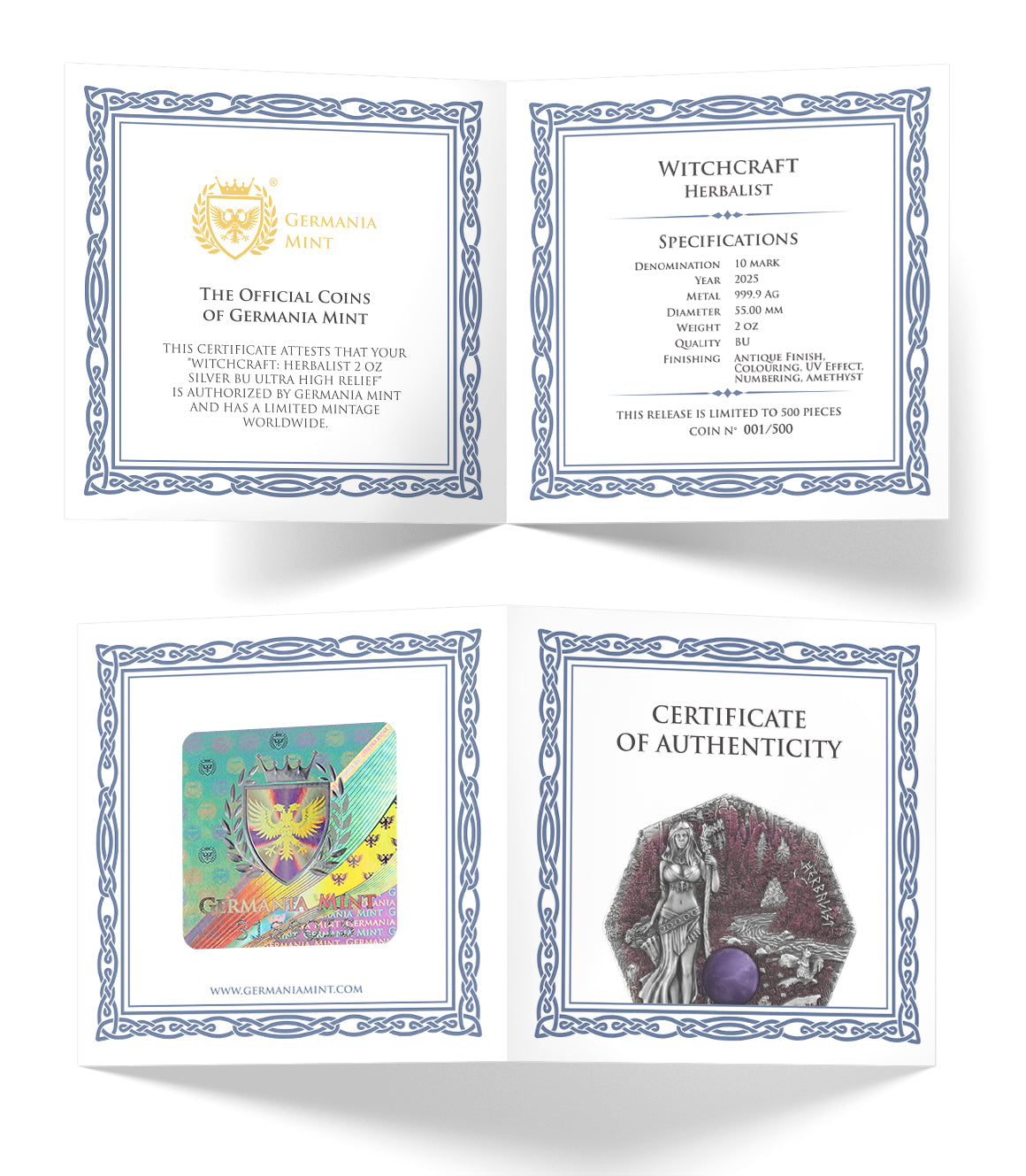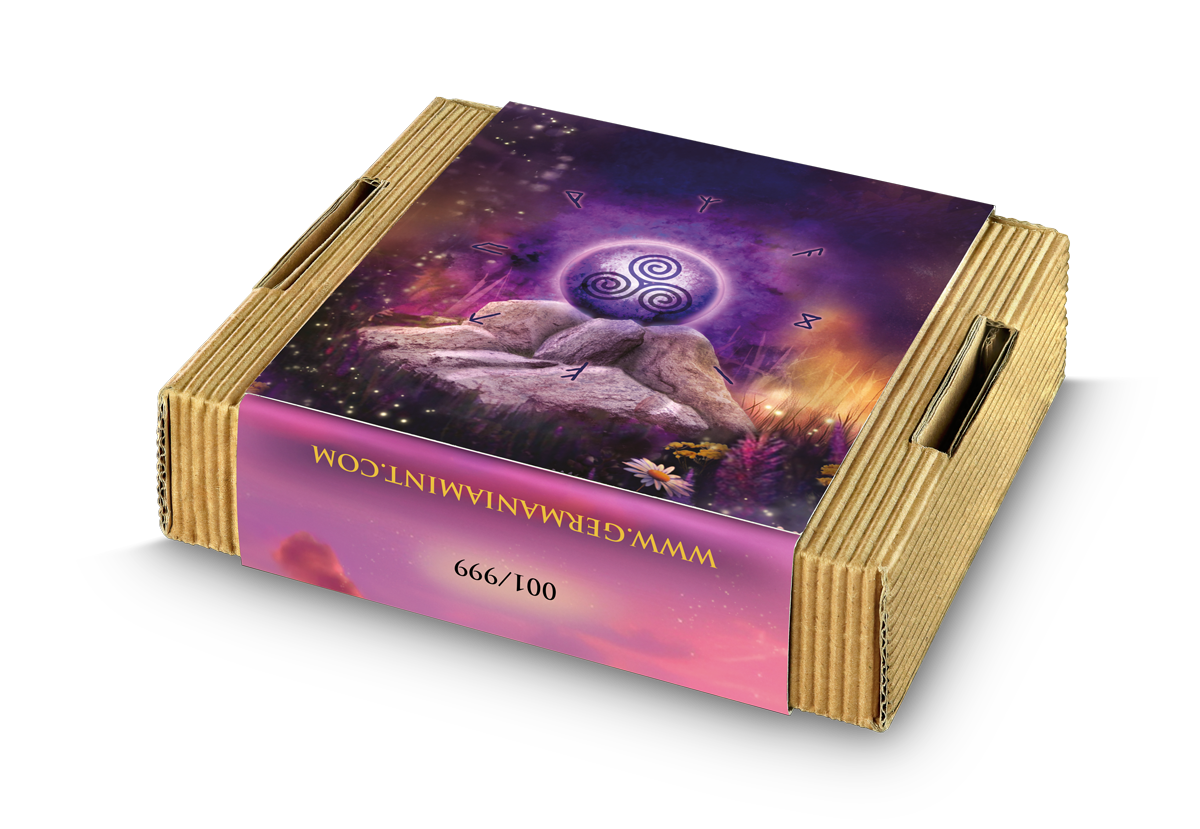 De keerzijde toont de iconische tweekoppige adelaar van Germania Mint, omringd door runen — een krachtige combinatie van symboliek, traditie en modern vakmanschap tot in elk detail.